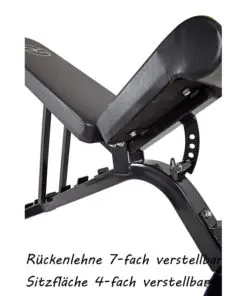 Die Multifunktionshantelbank von STRONG GAINS zeichnet sich vor allem durch Ihre Stabilität und Ihre Funktionalität aus. Die massive Konstruktion mit dem Stahlrahmen in 70/50/2 mm und einem Eigengewicht von 25 Kg lässt in Puncto Sicherheit und Stabilität keine Wünsche offen. Um die Bank komfortabel zu bewegen ist ein Griff vorne, sowie die Rollen hinten vorhanden. Alle Elemente sind leicht verstellbar, damit Sie die Hantelbank möglichst flexibel einsetzen können. Die Rückenlehne ist 7 fach verstellbar und kann sogar negativ eingestellt werden. Die Sitzfläche ist 4 fach verstellbar und das Beinpolster kann ebenfalls 4 fach in der Höhe verstellt werden und natürlich auch blitzschnell entfernt werden. Durch die gute Verstellbarkeit kann die Bank extrem vielseitig eingesetzt werden und dank der Beinhalterung können Sie auch mit Crunches/Situps die Bauchmuskeln trainieren. Die Rückenlehne ist mit 28 cm Breite und einer Länge von 87 cm, ideal für das Bankdrücken geeignet. Die Sitzfläche ist mit einer Breite con 34cm vorne/26 cm hinten und einer Länge von 36 cm großzügig bemessen. Die Polsterdicke beträgt stolze 7 cm und macht das Training auf dieser Hantelbank auch noch komfortabel.
